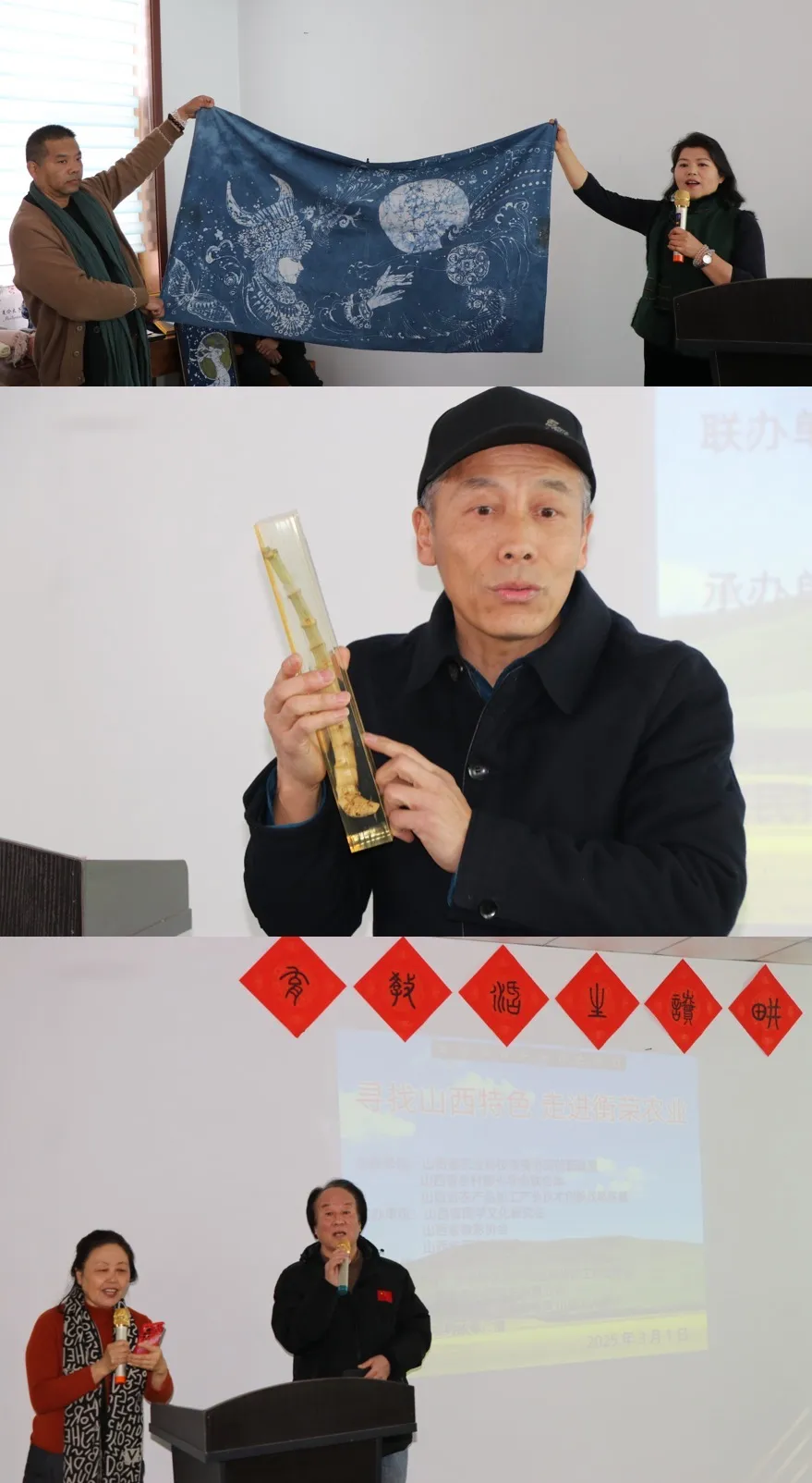 活动现场亮点纷呈:植物染非遗传承人任育萱通过“牛郎织女”主题扎染艺术展,将阳曲传统工艺与现代设计结合;仰望星空的文化学者吴刚阐述农耕文明与生态美学的哲学关联;太原市迎泽区文联原主席韩淑芳的诗朗诵《春天的田野》,更以艺术形式诠释了生态乡村的诗意图景。穿插其间的有机养生餐“好好吃饭”品鉴环节,则让参会者亲身体验“从田间到餐桌”的健康饮食理念。